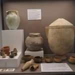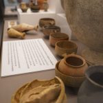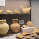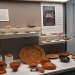 En la mesa contenedores de líquidos y jarras, junto a platos, vasos y copas de cerámica de paredes finas y en sigilata para beber, pues los recipientes de metal estaban destinados a las clases más altas. Y orzas y cantimploras o petacas destinadas al almacenaje y transporte de líquidos y sólidos.