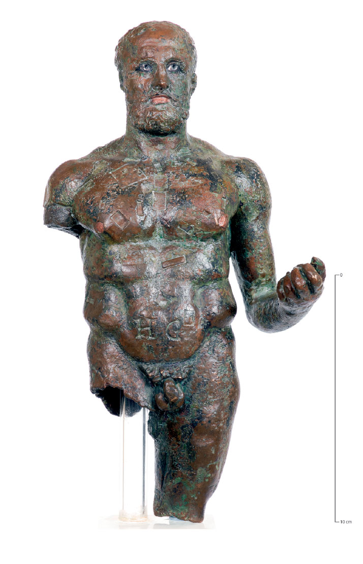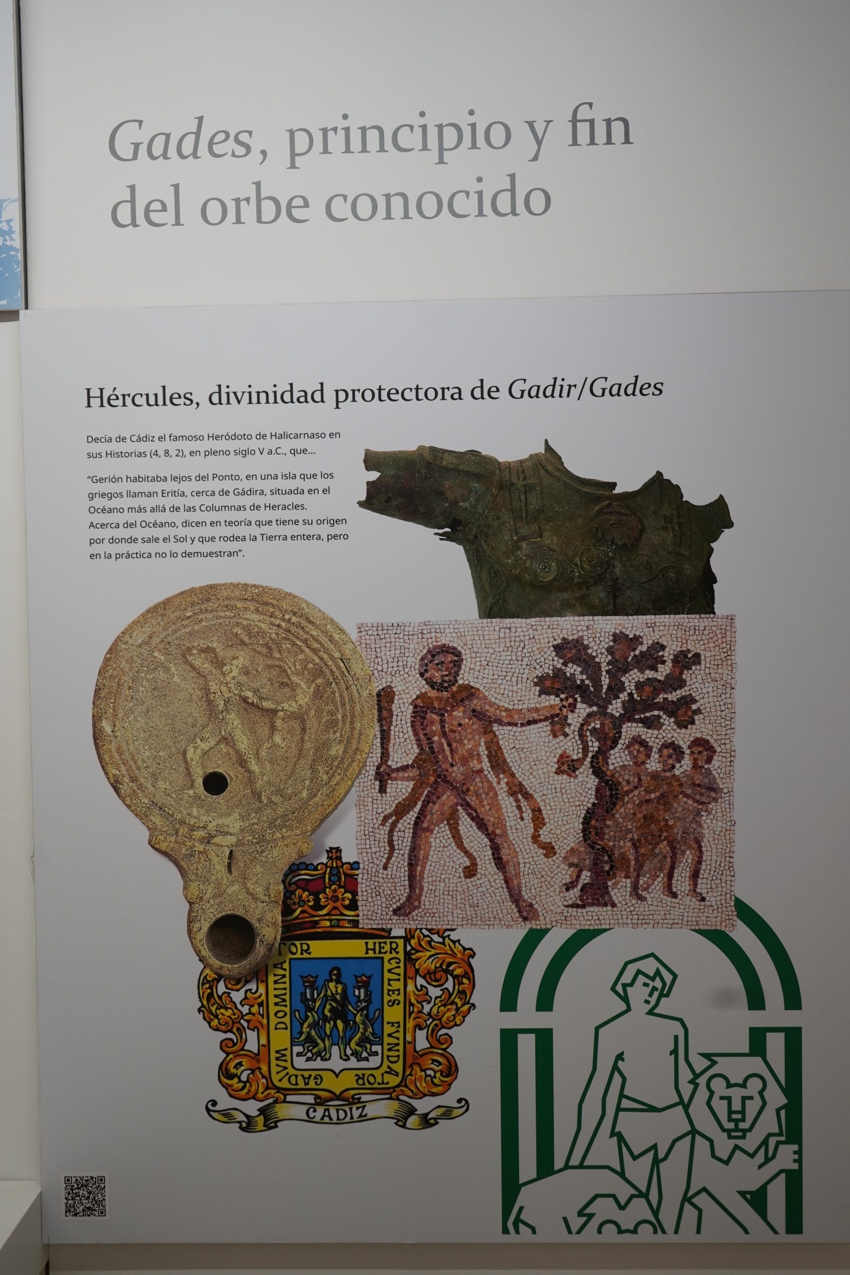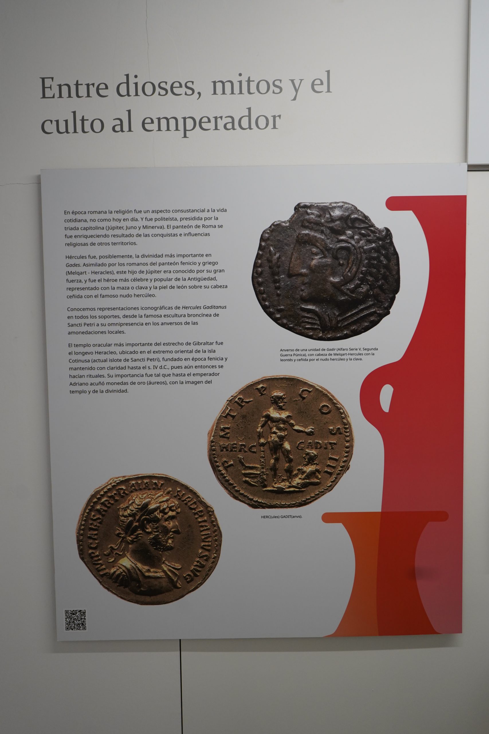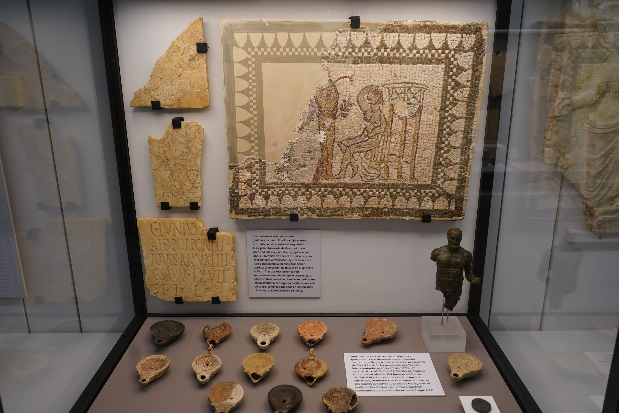 Hércules fue, posiblemente, la divinidad más importante en Gades. Asimilado por los romanos del panteón fenicio y griego (Melqart – Heracles), este hijo de Júpiter era conocido por su gran fuerza, y fue el héroe más célebre y popular de la Antigüedad, representado con la maza o clava y la piel de león sobre su cabeza ceñida con el famoso nudo hercúleo. Conocemos representaciones iconográficas de Hercules Gaditanus en todos los soportes, desde la famosa escultura broncínea de Sancti Petri a su omnipresencia en los anversos de las amonedaciones locales.