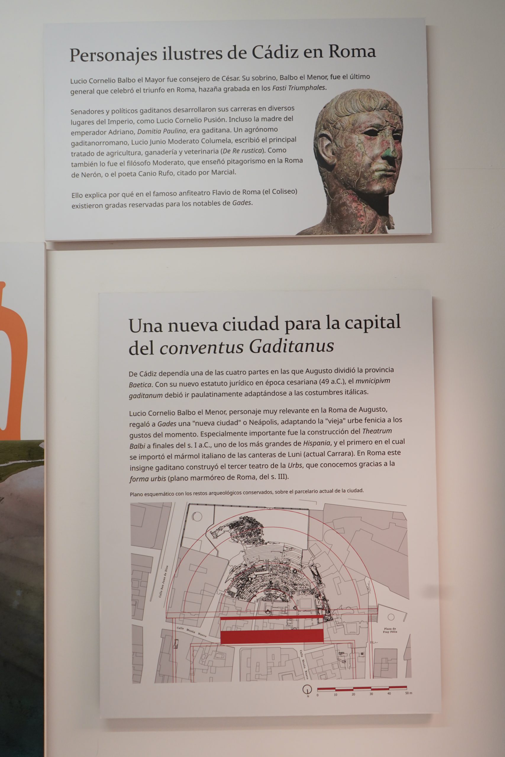 Lucio Cornelio Balbo el Menor, personaje muy relevante en la Roma de Augusto, regaló a Gades una “nueva ciudad” o Neápolis, adaptando la “vieja” urbe fenicia a los gustos del momento. Especialmente importante fue la construcción del Theatrum Balbi a finales del s. I a.C., uno de los más grandes de Hispania, y el primero en el cual se importó el marmol italiano de las canteras de Luni (actual Carrara). En Roma este insigne gaditano construyó el tercer teatro de la Urbs, que conocemos gracias a la forma urbis (plano de Roma de mármol, del s. III).