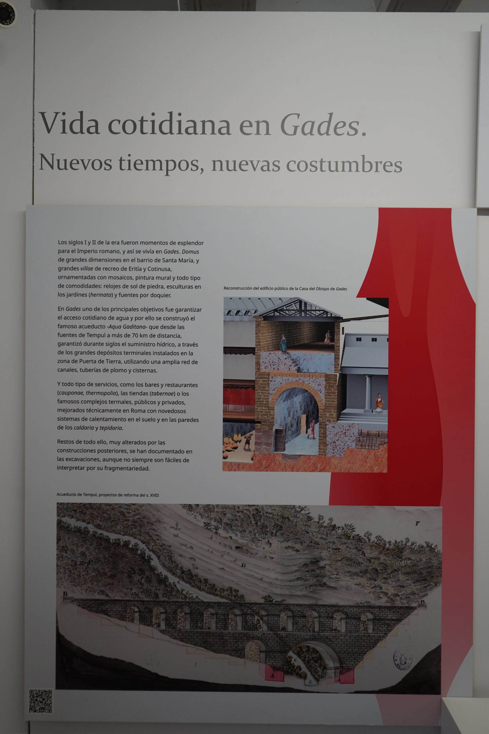 En Gades uno de los principales objetivos fue garantizar el acceso cotidiano de agua y por ello se construyó el famoso acueducto –Aqua Gaditana– que desde las fuentes de Tempul a más de 70 km de distancia, garantizaron durante siglos el suministro hídrico, a través de los grandes depósitos terminales instalados en la zona de Puerta de Tierra, utilizando una amplia red de canales, tuberías de plomo y cisternas.