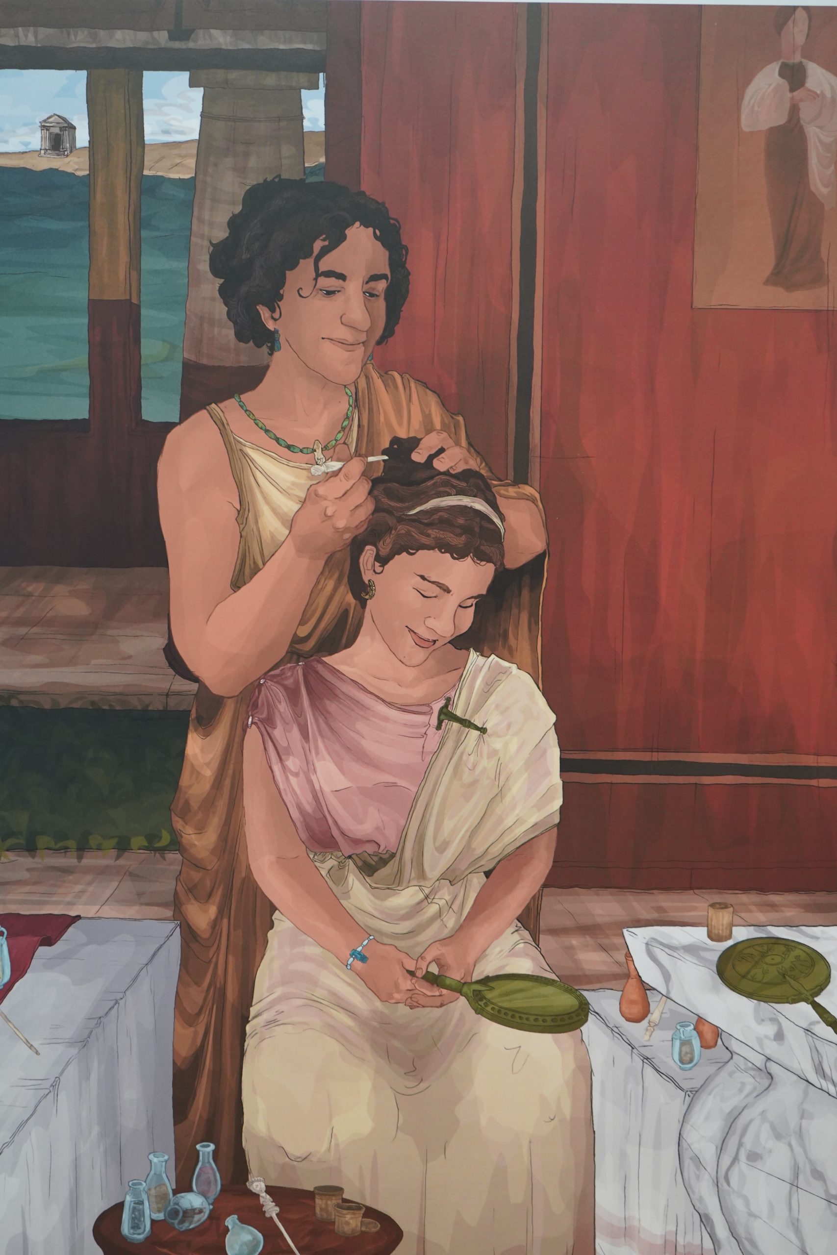 Dos de ellas fueron representadas en una habitación ricamente decorada a mediados del s. I con pintura del III estilo pompeyano en la Casa del Obispo. Melpómene con una máscara trágica y una clava, y Clío, con un díptico con algunas líneas de escritura apoyado sobre un pedestal. Posiblemente con Apolo como protagonista de una escena mitológica, del cual solo se conserva su rostro. Estas pinturas encuentran múltiples paralelos en Pompeya y en otros importantes yacimientos mediterráneos.