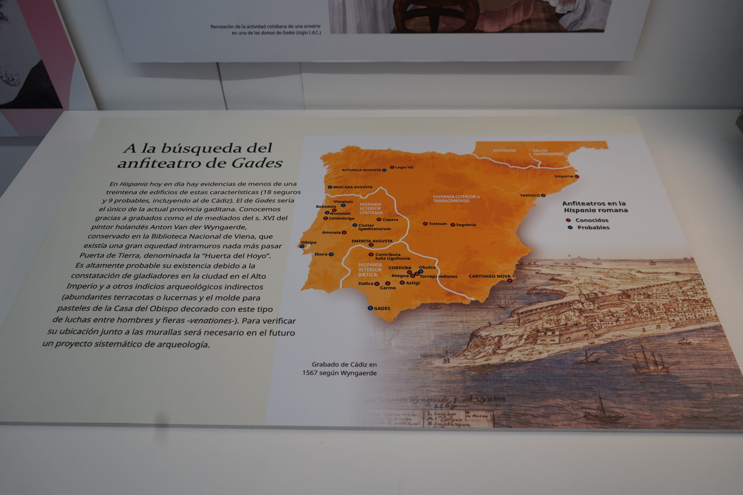 En Hispania hoy en día hay evidencias de menos de una treintena de edificios de estas características (18 seguros y 9 probables, incluyendo al de Cádiz). El de Gades sería el único de la actual provincia gaditana. Conocemos gracias a grabados como el de mediados del s. XVI del pintor holandés Anton Van der Wyngaerde, conservado en la Biblioteca Nacional de Viena, que existía una gran oquedad intramuros nada más pasar Puerta de Tierra, denominada la “Huerta del Hoyo”. Es altamente probable su existencia debido a la constatación de gladiadores en la ciudad en el Alto Imperio y a otros indicios arqueológicos indirectos (abundantes terracotas o lucernas y el molde para pasteles de la Casa del Obispo decorado con este tipo de luchas entre hombres y fieras –venationes-). Para verificar su ubicación junto a las murallas será necesario en el futuro un proyecto sistemático de arqueología.
