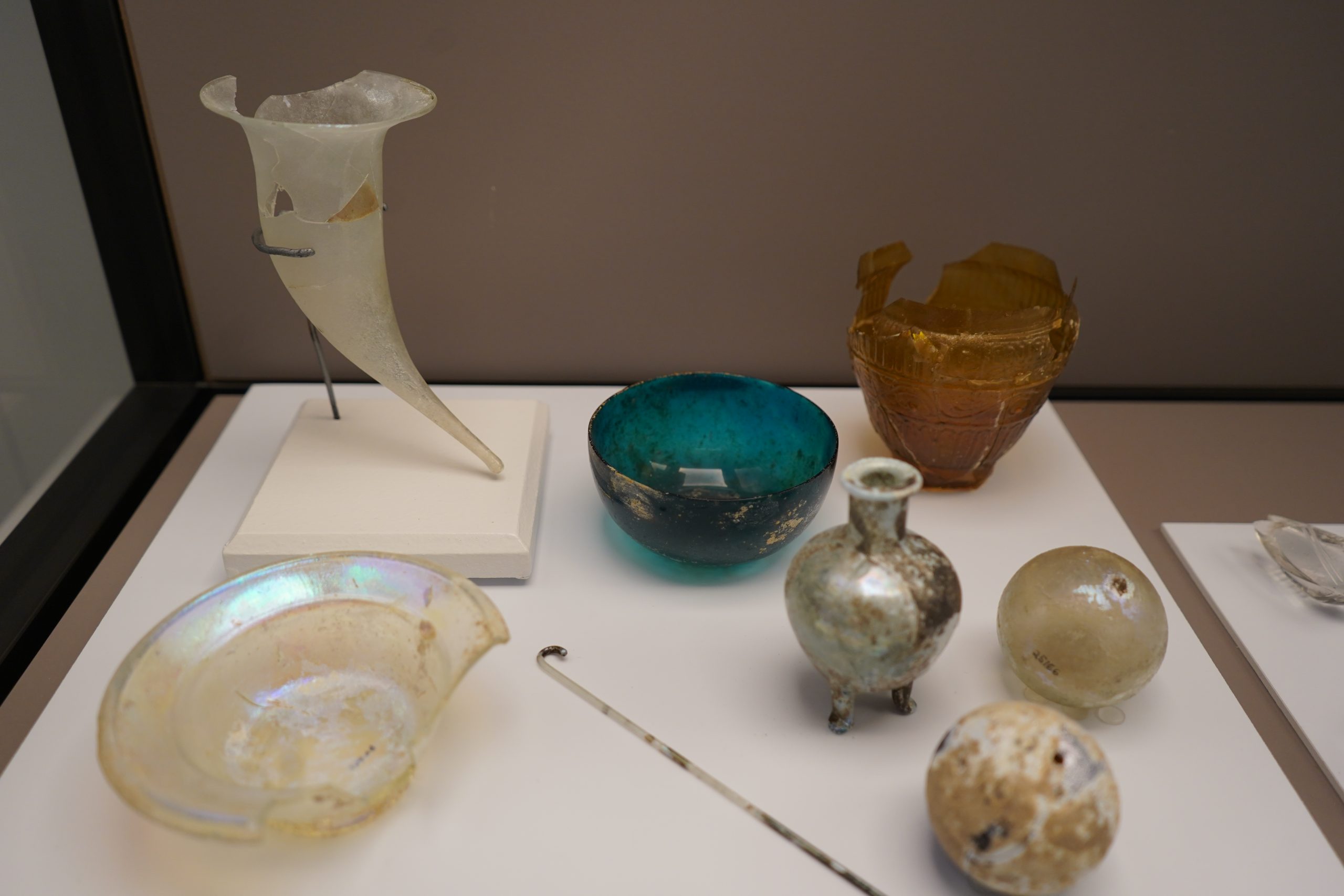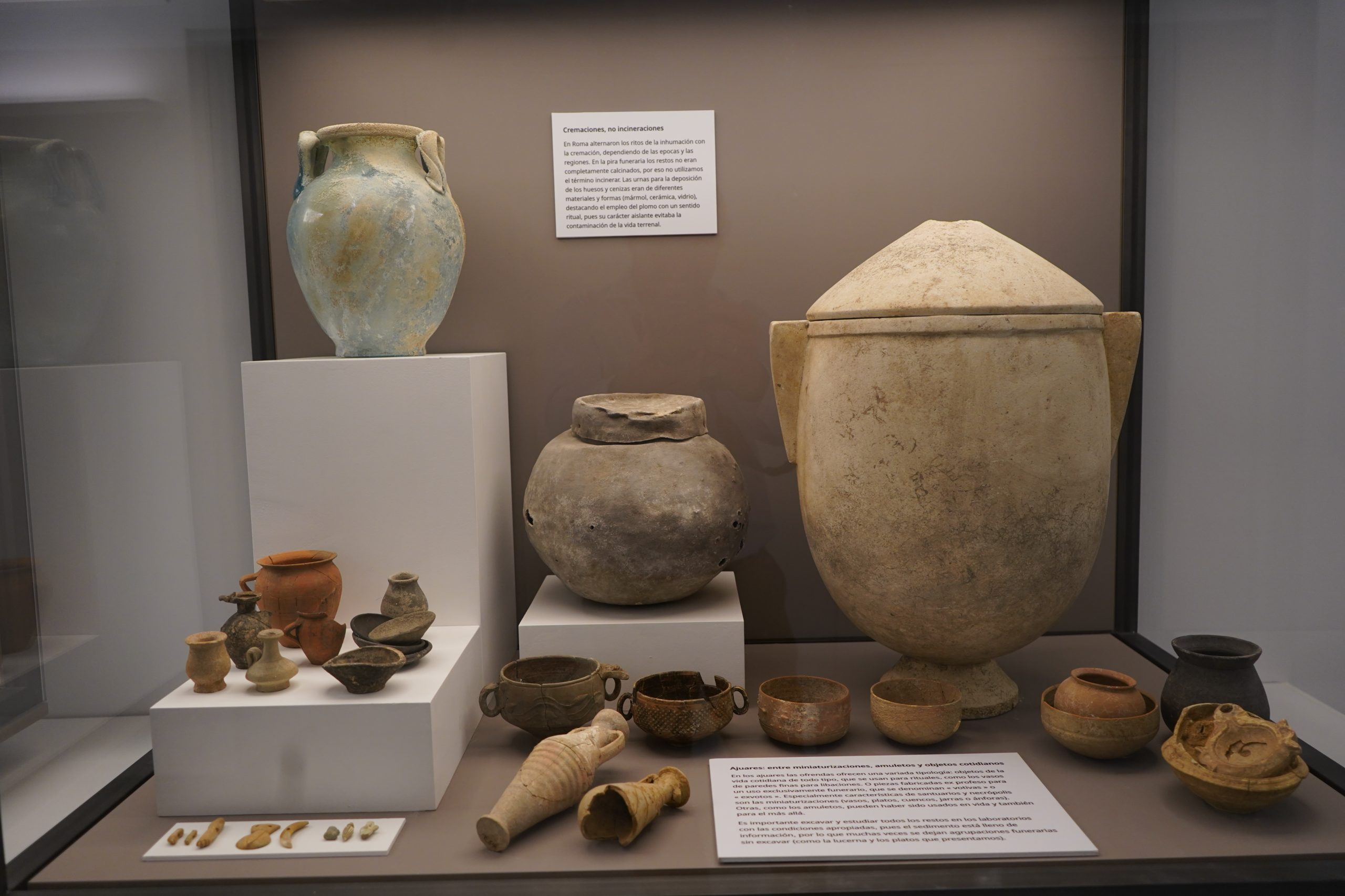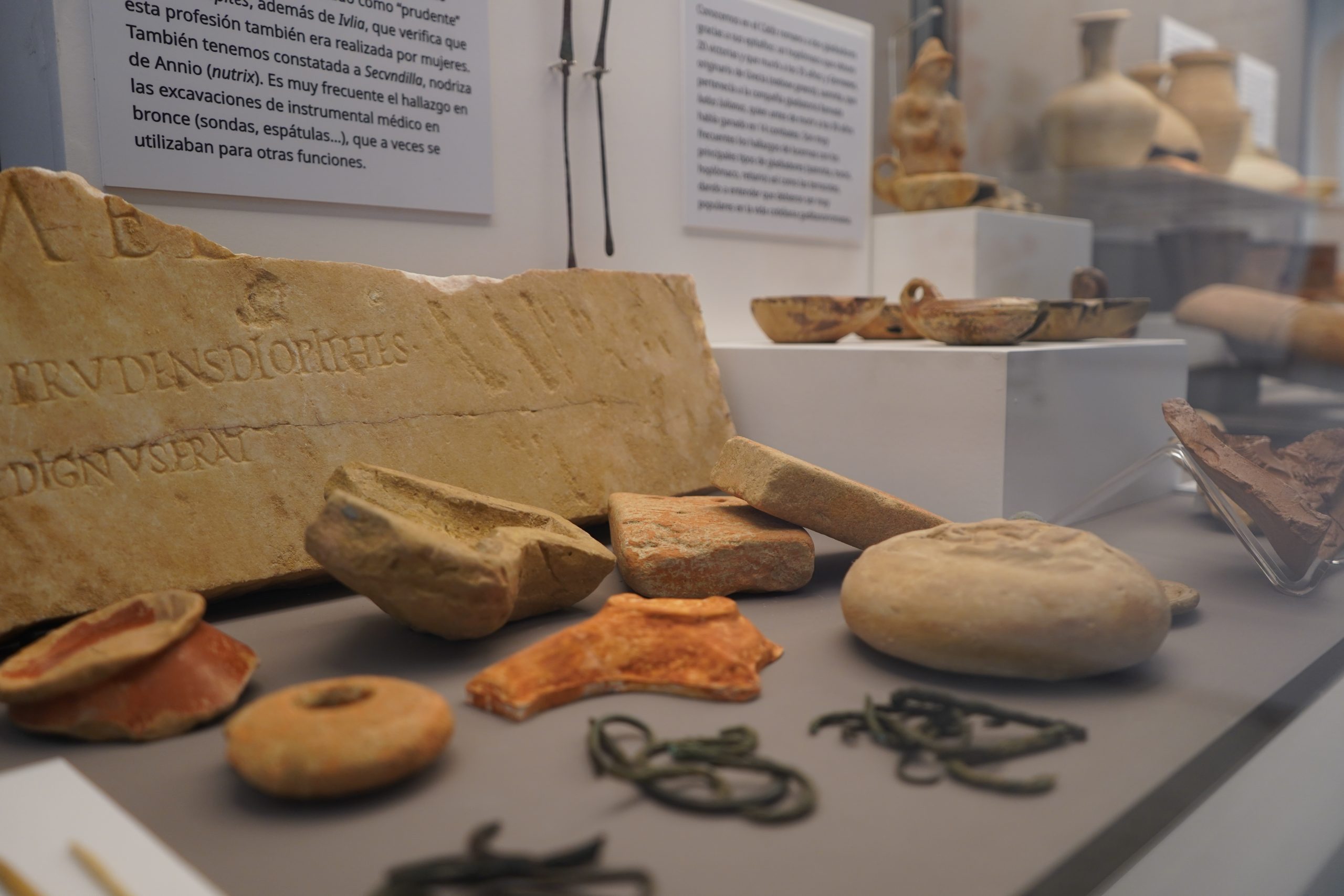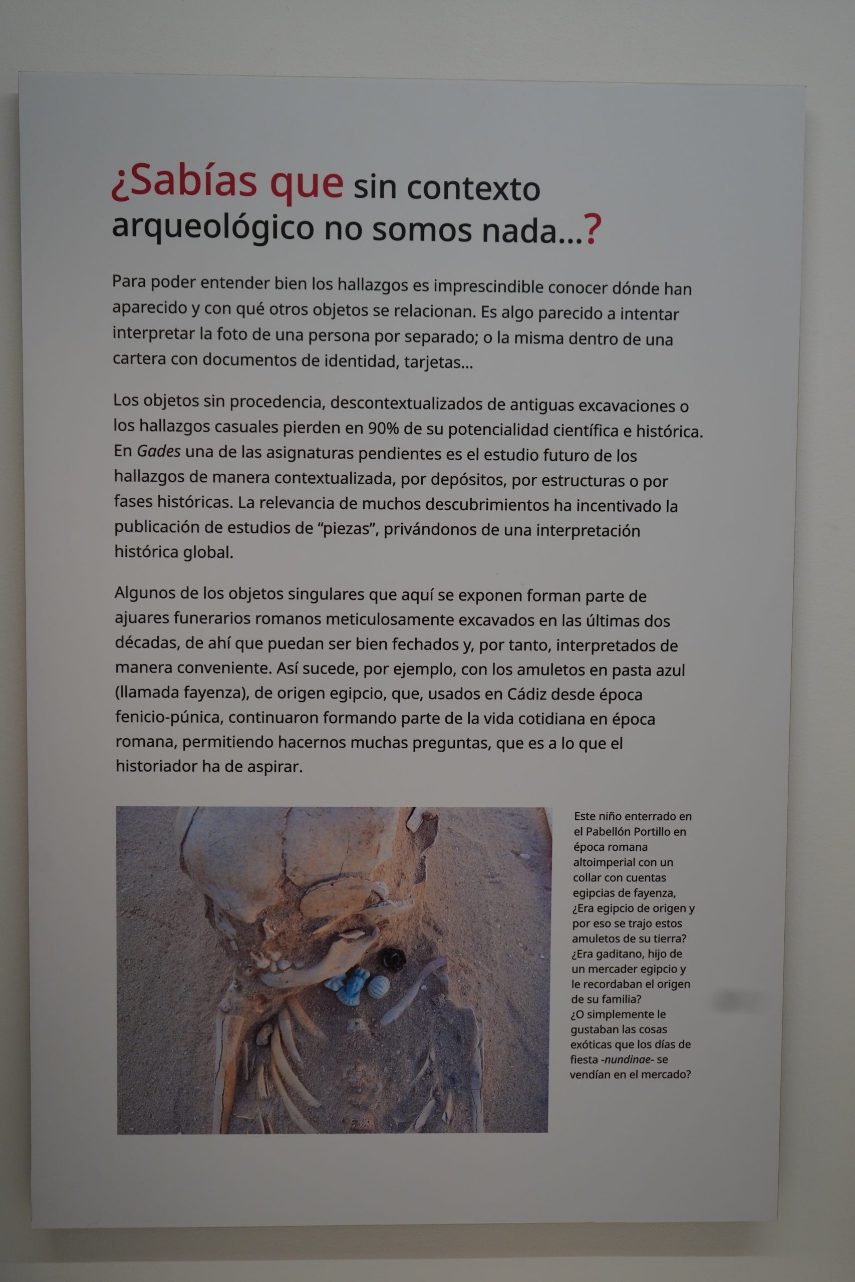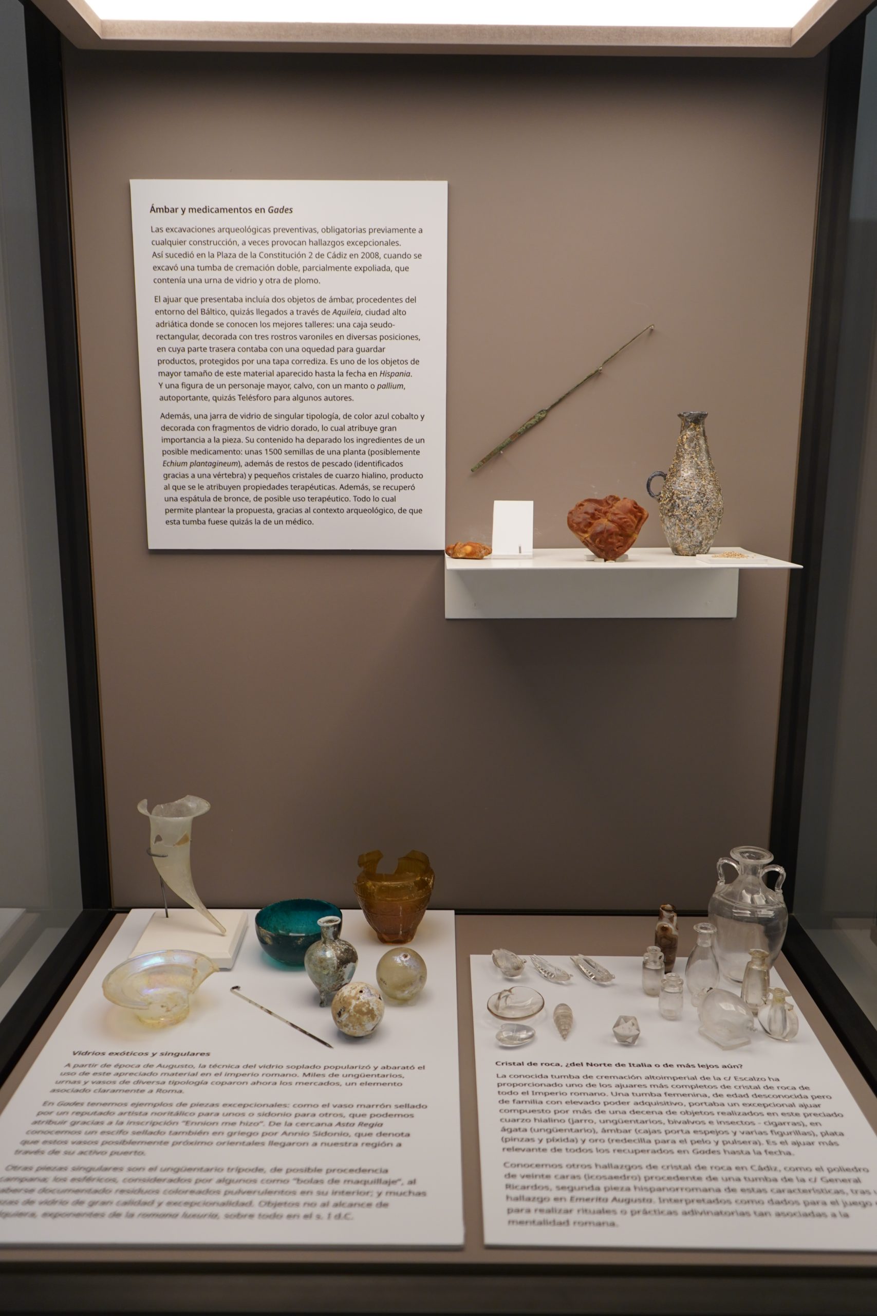 Algunas de los objetos singulares que aquí se exponen forman parte de ajuares funerarios romanos meticulosamente excavados en las últimas dos décadas, de ahí que puedan ser bien fechados y, por tanto, interpretados de manera conveniente. Así sucede, por ejemplo, con los amuletos en pasta azul (llamada fayenza), de origen egipcio, que, usados en Cádiz desde época fenicio-púnica, continuaron formando parte de la vida cotidiana en época romana, permitiendo hacernos muchas preguntas, que es a lo que el historiador ha de aspirar.