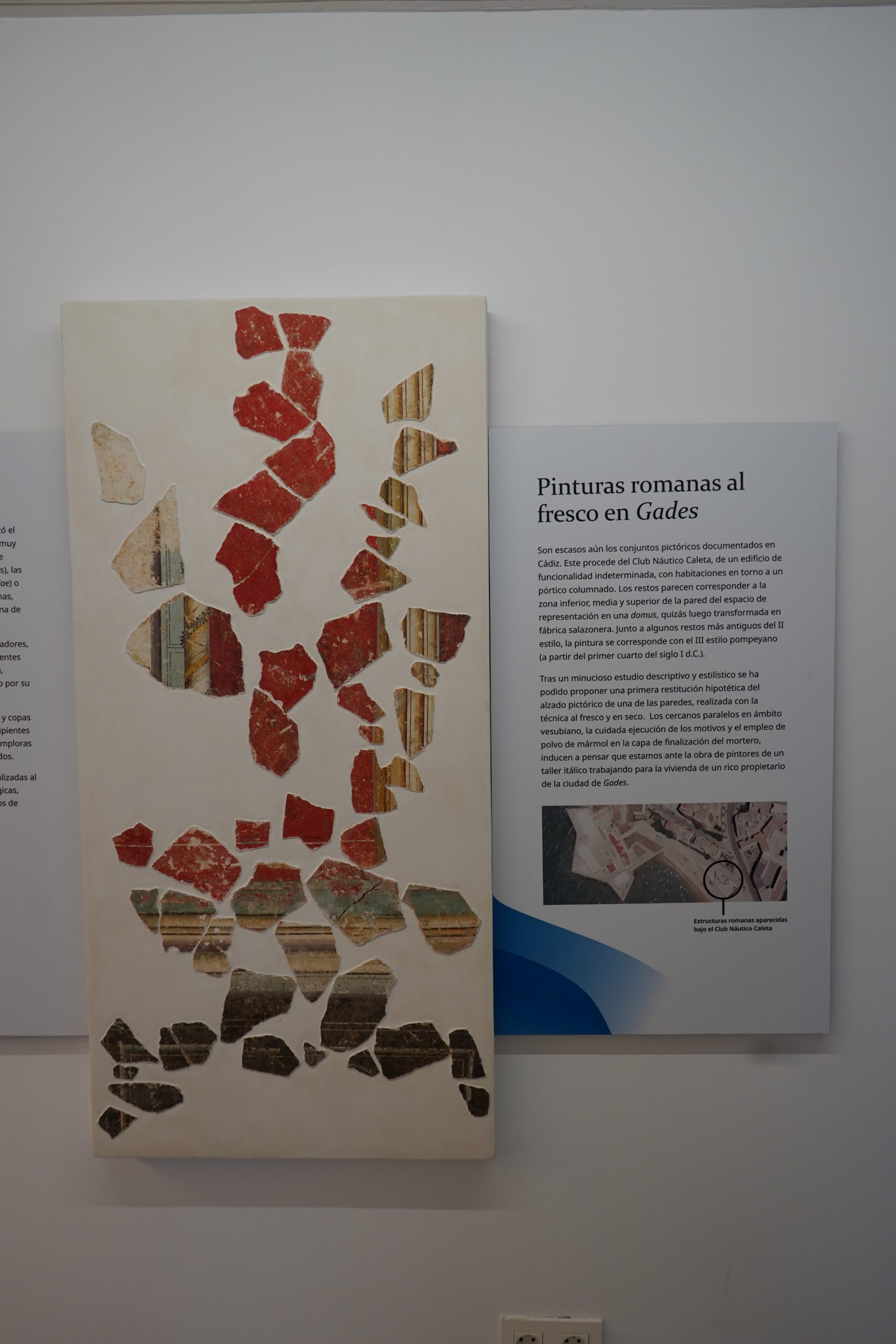 Son escasos aún los conjuntos pictóricos de gran tamaño documentados en la ciudad de Cádiz. Este procede del Club Náutico Caleta, de una excavación preventiva realizada en un lugar muy cercano al estrecho interinsular. Pertenece a un edificio de funcionalidad indeterminada, dotado de varias habitaciones en torno a un pórtico columnado, habiendo sido interpretado como una posible fábrica salazonera. Es evidente que o bien originalmente no fue así (pues las cetariae no presentan las paredes decoradas) o que existieron junto a las chancas salazoneras otros ámbitos domésticos, pues los restos estudiados parecen corresponder a la zona inferior, media y superior de la pared del espacio de representación en una domus. Junto a algunos restos más antiguos del II estilo, que denotan que las paredes estuvieron decoradas en diversos momentos, la totalidad de la pintura al fresco conservada se corresponde con las llamadas fases IC-IIA del III estilo pompeyano, fechadas a partir del primer cuarto del siglo I d.C. en adelante.