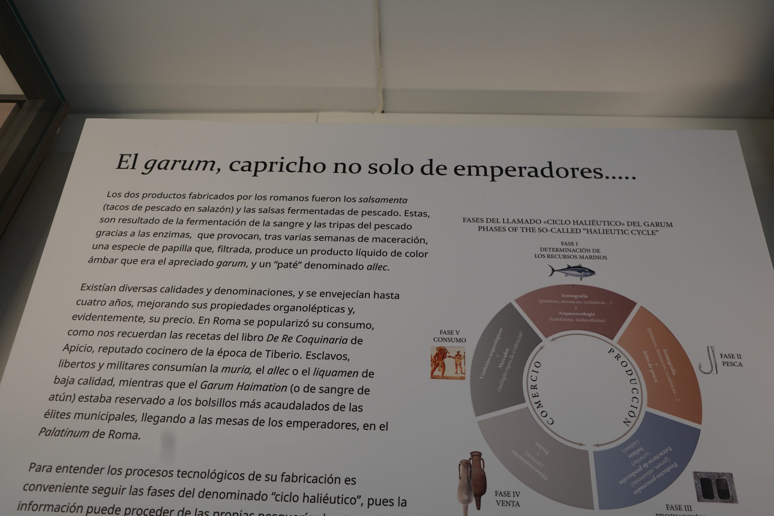 Existían diversas calidades y denominaciones, y sabemos que estos productos se envejecían hasta cuatro años, mejorando sus propiedades organolépticas y, evidentemente, incrementando su precio. Frente a épocas anteriores, en Roma se popularizó su consumo, y era usado cotidianamente en la cocina, como nos recuerdan las recetas del libro De Re Coquinaria de Apicio, reputado cocinero de la época de Tiberio. Esclavos, libertos y militares consumían la muria, el allec o el liquamen de baja calidad, mientras que el Garum Haimation (o de sangre de atún) estaba reservado a los bolsillos más acaudalados de las élites municipales, llegando con asiduidad a las mesas de los emperadores, en el Palatinum de Roma. Para estudiar y entender estos productos alimenticios, y los procesos tecnológicos de su fabricación es conveniente seguir las fases del denominado “ciclo haliéutico” o de la industria pesquero-conservera, pues la información puede proceder de las propias pesquerías hasta cualquier lugar de consumo situado en las tierras del interior, hasta donde llegaban estas delicatessen.
