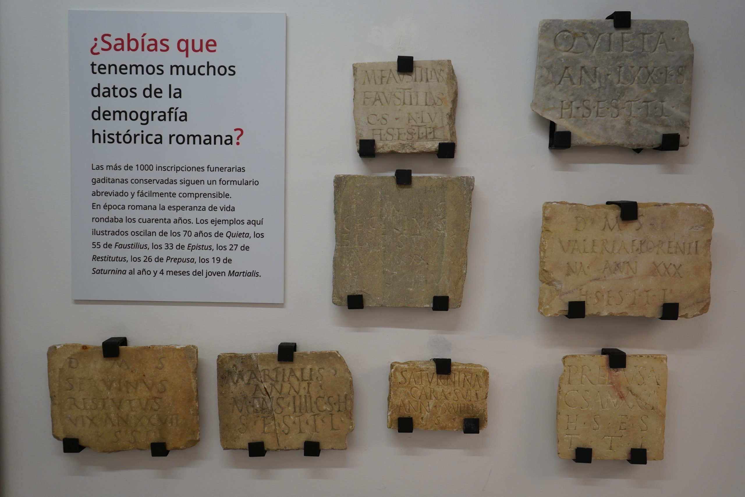 En época romana la esperanza de vida rondaba los cuarenta años, aunque hay ejemplos de difuntos de todas las edades. Los ejemplos aquí ilustrados oscilan de los 70 años de Quieta, los 55 de Faustilius, los 33 de Epistus, los 27 de Restitutus, los 26 de Prepusa, los 19 de Saturnina y 1 año y 4 meses del joven Martialis.