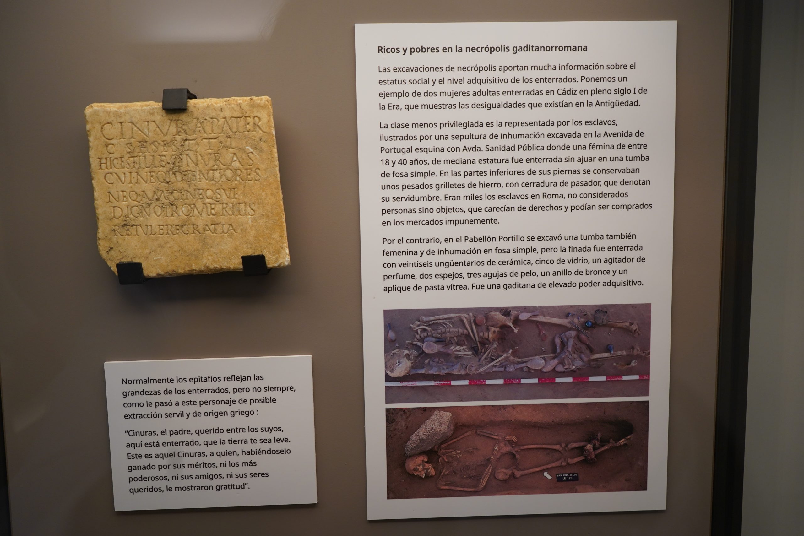 Frente a épocas precentes, en las cuales las tumbas no aportan explicitamente datos onomásticos de los difuntos, las más de 1000 inscripciones funerarias gaditanas conservadas aportan muchos datos de interés sobre la población romana, siguiendo un formulario muy abreviado y fácilmente comprensible, como actualmente en nuestros cementerios. Consagración a los Dioses Manes (Diis Manibus sacrum), nombre del difunto (tria nomina, duo nomina o cognomen), edad en años y a veces en meses -para los más jóvenes-, y fórmulas como « querido/a para los suyos » (carus/a suis), aquí está enterrado/a (hic situs/a est) y « que la tierra te sea leve » (sit tibi terra levis). Las de los sectores más nobles eran mucho más amplias.