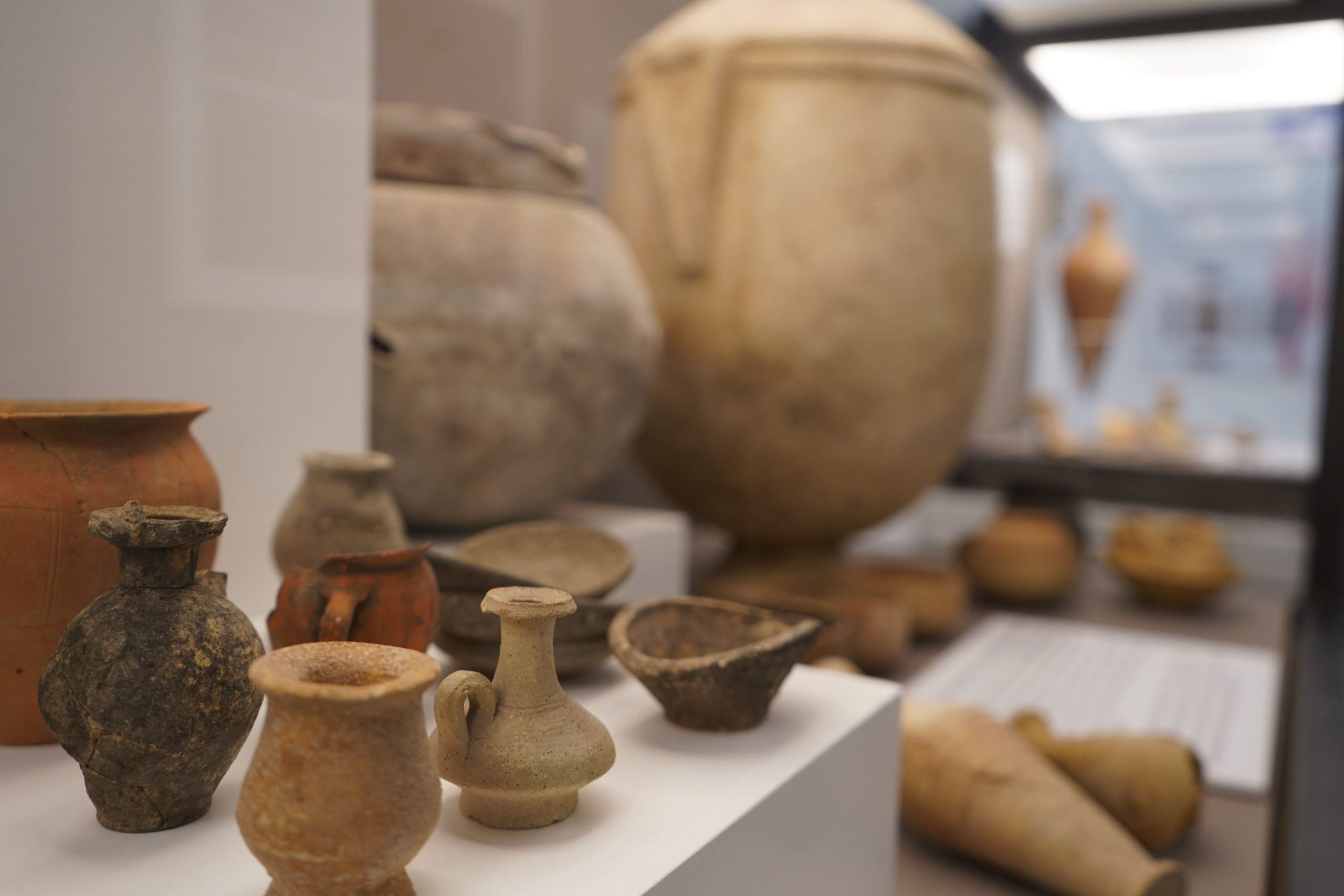En la mesa contenedores de líquidos y jarras, junto a platos, vasos y copas de cerámica de paredes finas y en sigilata para beber, pues los recipientes de metal estaban destinados a las clases más altas. Y orzas y cantimploras o petacas destinadas al almacenaje y transporte de líquidos y sólidos.